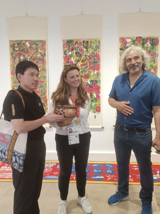 7月25日,在法國巴黎,來自三門峽市的王新軍(左)與現(xiàn)代奧林匹克運動會之父顧拜旦的曾孫女黛安·德·納瓦塞爾·德·顧拜旦夫人(中)進行文化交流。王新軍作為仰韶彩陶制作技藝的領軍人物,他精心制作了“花開奧運”經典彩陶盆與廟底溝花瓣紋彩陶盆,參加此次巴黎奧運文化體育交流活動。